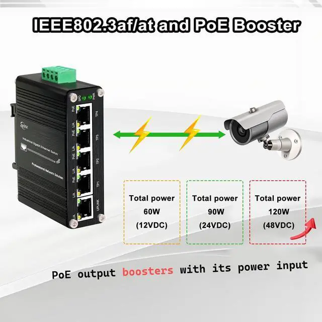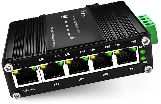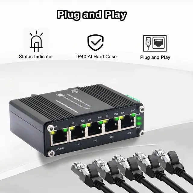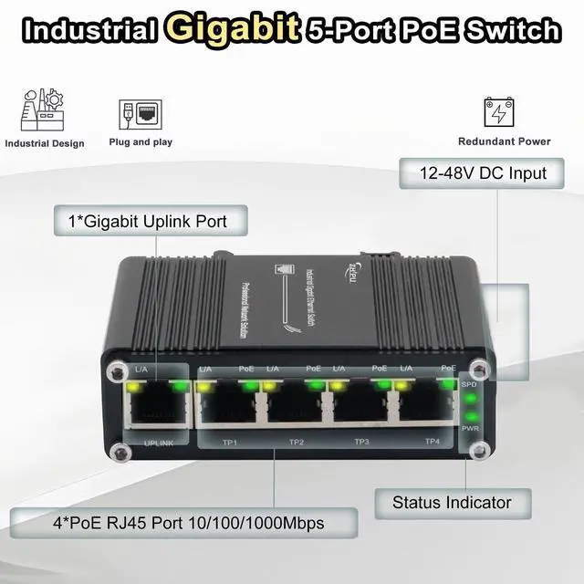 5-Port Gigabit PoE Ethernet SwitchThis Ethernet Switch supports 10/100/1000Mbps self-adaption, achieving speeds up to 1000Mbps, allowing for high-speed network, video and data-intensive transmission. ^^ PoE functionThis Switch supports IEEE 802.3 af/at PoE (30W), can easily power multiple devices, reducing the need for additional power cables or adapters. ^^ Redundant power supplyFor adding reliability, this switch is equipped with redundant power inputs, providing backup power in the event of a power outage or failure, ensuring uninterrupted network connectivity. ^^ Easy Installation & Robust BuildSupports DIN-Rail and wall-mount installation, with rugged construction to withstand vibration and shock in industrial settings.