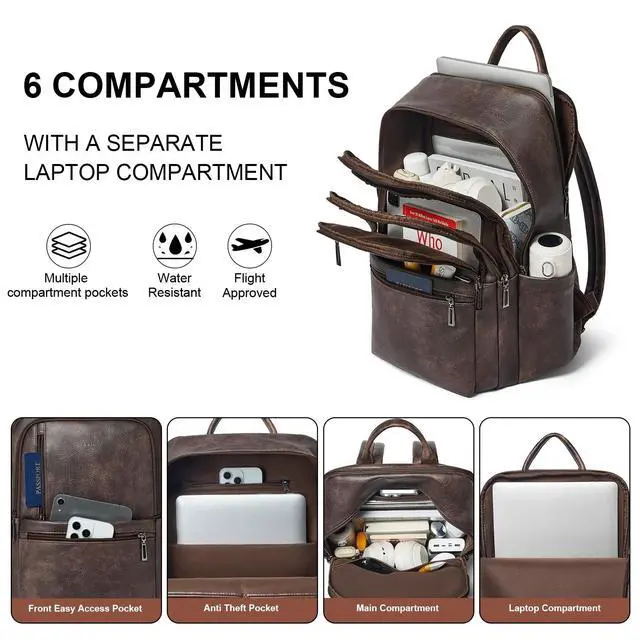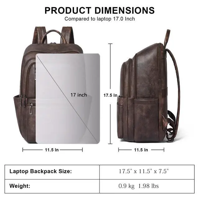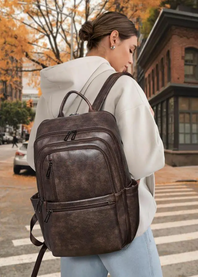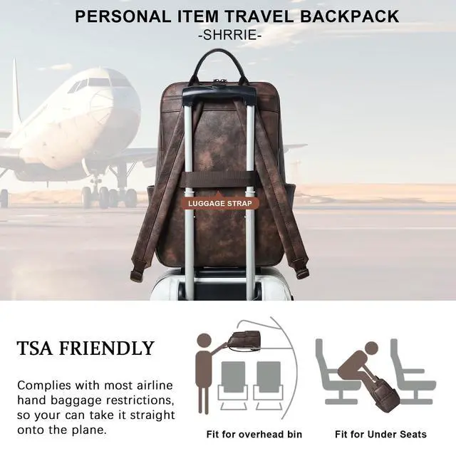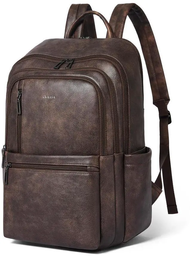 PREMIUM MATERIALSShrrie Laptop Backpack for Women crafted from premium, soft, and durable waterproof PU leather. It features a high-quality fabric lining, robust metal hardware, smooth zippers, and exquisite craftsmanship. With reinforced stitching and a waterproof design, it's a reliable choice for commuting, hiking, or getaways. Furthermore, its simple and unisex design makes it not just a women's backpack, but also a perfect laptop bag for anyoneeven as a stylish couple's bag. ^^ Independent Laptop Bag The vegan leather backpack purse size is 12.6 " (L) x 7.9 " (W) x 17.7 " (H) and weight: 2.2 lbs. It features a zippered compartment with a dedicated, padded divider for your 17-inch laptop. Its versatile design makes it suitable for a variety of situations, suitable for use as a student backpack, business backpack, work backpack, airport backpack, travel backpack or everyday fashion backpack, helping you to keep your belongings organised. ^^ Practical Backpack Luggage Strap DesignThis 17 inch laptop backpack is designed for travel, helps free your hands and alleviates back strain, enhancing comfort and convenience on the go. As a compact, waterproof carry-on, it easily fits under airplane seats and complies with standard airline size requirements. Leather backpacks may have a slight odor. Simply leave it in a well-ventilated area for 23 days and the smell will fade. ^^ Multi-Compartment DesignOur travel backpack for women with 13 pockets, the main double-zippered compartment features an inner zipped pocket, two slip pockets and a padded for electronics. On the outside, there is a laptop compartment zipped pockets, three front zipped pockets, two big zipped pockets and two cup pockets. There is ample space for your laptop, mobile phones, books, iPads, A4 documents, umbrellas, power bank, glasses, cosmetics and clothing.