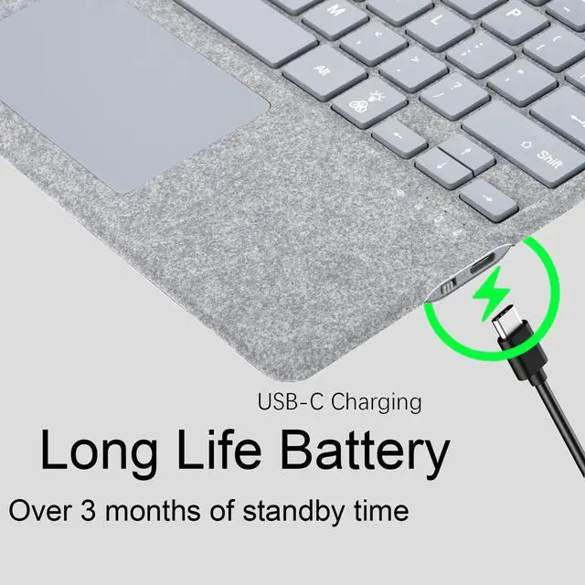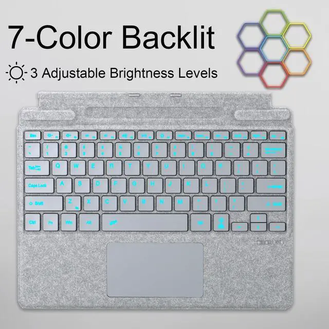 ^^ Type-C charging port: Charge keyboard externally with USB cable included. (NOT charged via magnetic attach). Equipped with 7-color LED backlight and 3 adjustable brightness options. Ultra thin and lightweight, easy to carry.