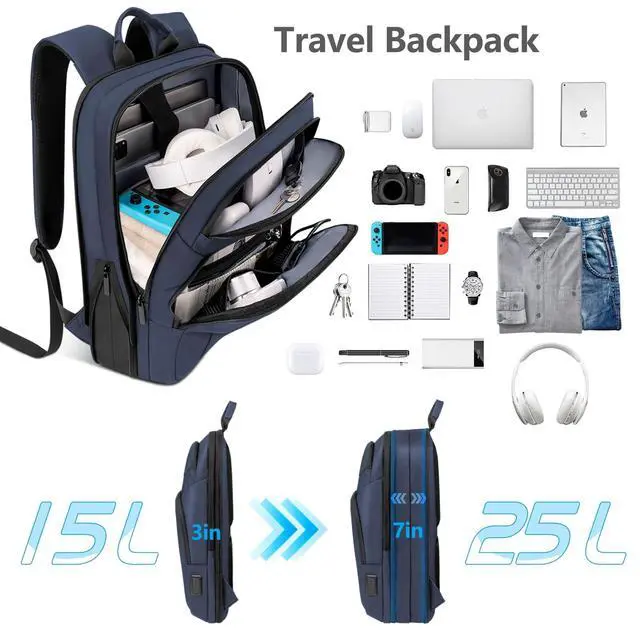 Expandable & Large CapacityThis travel laptop backpack for men fits most 17.3 inch laptops. The work backpack for men weigh only 900g (2 lbs), The computer backpack capacity can be expanded from 15 liters to 25 liters. The standard size18 x 12 x 3 inch. Ideal for work, commute or college. The expanded size18 x 12 x 7 inch. Ideal for travel, vacation or business. This casual lightweight backpack suitable for any occasion. ^^ USB Charging PortThis business backpack for men features a built-in USB charging port, allowing you to conveniently charge your devices on the goperfect for business trips or vacations (power bank is not included).