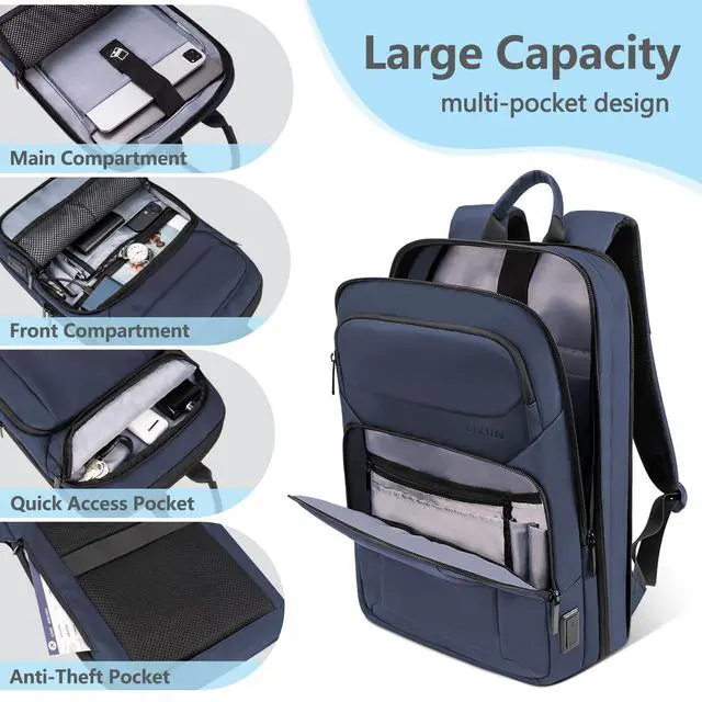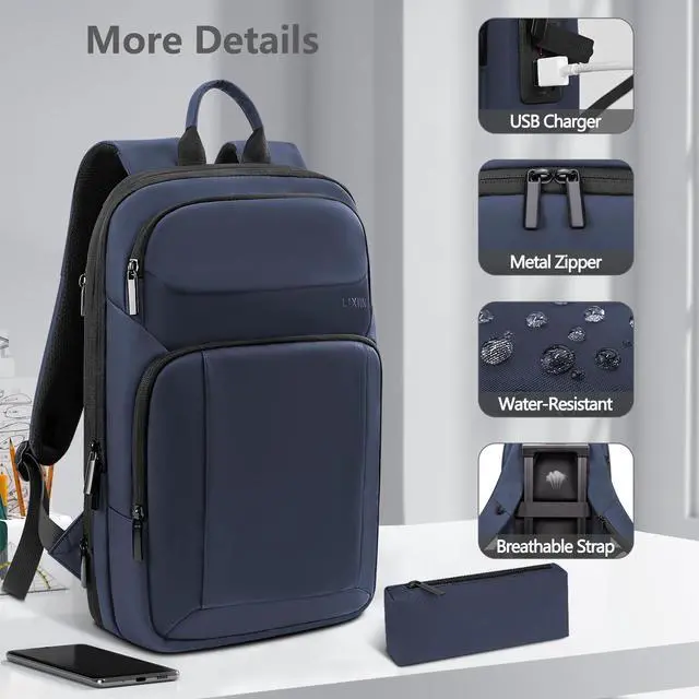 The slim laptop backpack for men has Multiple specialized compartments keep your items organized and easily accessible. ^^ Anti-theft Backpack. There is a theft-proof pocket on the front of the laptop backpack for men with a hidden zipper. You can put your cell phone, headphones, and other items that you need to use at any time in it.. There is a quick-access pocket on the side of the back of the slim backpack for men. You can take out items without having to put down your heavy smart backpack, which is very convenient.
