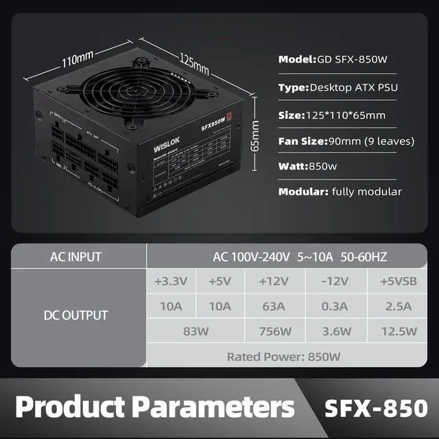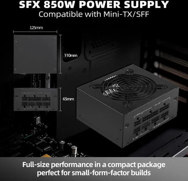 >1. [High-performance and Stable Power Supply] Offers 85% energy efficiency with a full module design and 850W continuous output (100-240V). Single-channel +12V rail (40A) supports mid-range Gpus such as NVIDIA RTX 3060/4060, can drive 4090 graphics cards, and features the latest 16P graphics card interface to ensure smooth gaming and multitasking. 2. [Silent Automatic Temperature Control] The 90mm hydraulic bearing fan adjusts its speed according to the load, maintaining a low decibel noise level, allowing for silent operation in home theaters or offices. Self-heating fan power module3. [Ideal for SFF Construction] The SFX form factor (125mm x 100mm x 63.5 mm) is suitable for narrow Spaces.