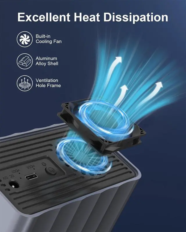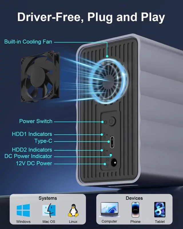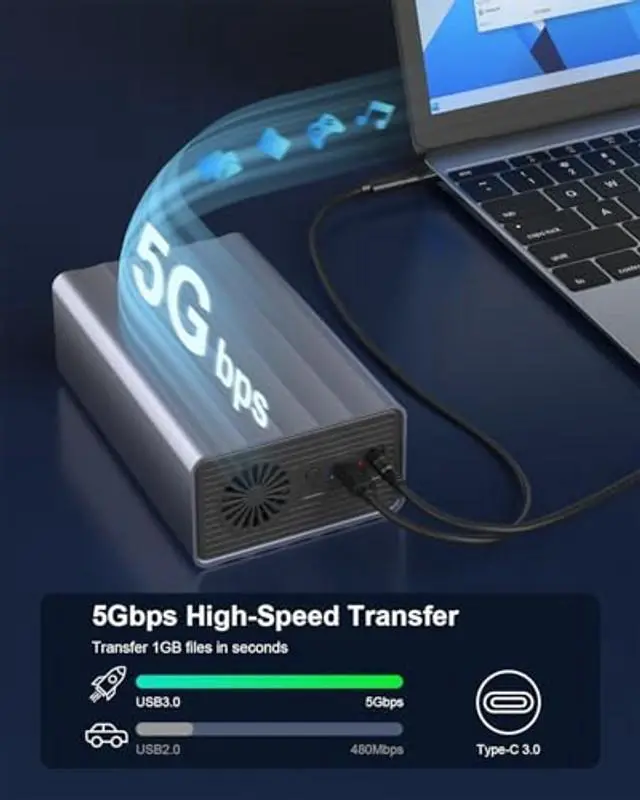 Reliable Operation: Experience high-speed data transfers of up to 5Gbps via the versatile USB 3.0 interface. The included 2-in-1 data cable (USB-C to USB-A) makes this USB hard drive enclosure compatible with a vast array of modern and legacy devices, from the latest laptops to standard desktops. Crafted from durable aluminum, this HDD enclosure is built to last. Its integrated cooling system, combining a quiet fan and a ventilated side panel, effectively manages heat to ensure your valuable HDDs or SSDs run optimally and maintain data integrity.