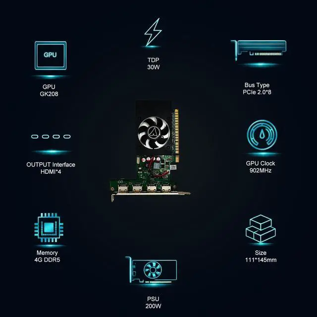 Unique 4x HDMI Multi-Tasking HubTransform your PC into a command center with four dedicated HDMI ports. Drive multiple 1080p or 4K displays seamlessly for financial dashboards, creative workspaces, or immersive home entertainment setups, all through a single, cable-friendly card. ^^ Dedicated 4GB GDDR5 Memory for ResponsivenessExperience fluid multitasking with dedicated GDDR5 memory. This 4GB buffer efficiently handles modern operating systems, browser tabs, and multimedia applications, ensuring crisp visuals and responsive performance across all connected screens. ^^ Versatile Low-Profile CompatibilityDesigned for universal fit, this half-height card includes both low-profile and standard brackets.