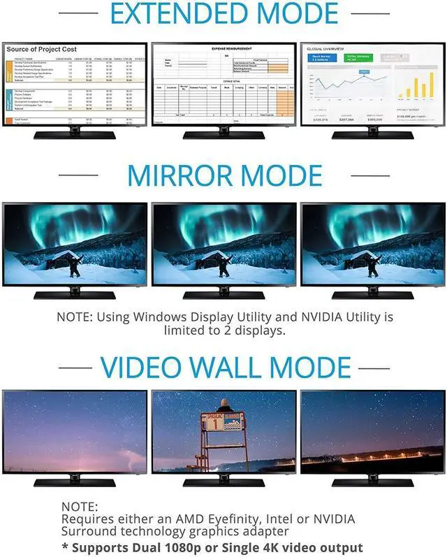 IMPORTANT NOTES! 1) DisplayPort 1.2 GPU/Graphics card required ^^^^ 2) Requires GPU/Graphics card supporting more than 2 external displays ^^^^ 3) Intel HD Graphics are limited to 3 external monitors altogether ^^^^ ** See Product Description for more important information. Contact us before purchasing if you are not sure about compatibility ^^ 3 EXTERNAL DISPLAYS Connect three DisplayPort displays to your system through a single DisplayPort 1.2 output (NOT HDMI); work as a splitter, extended mode, or expand mode joining multiple screens together as one display.