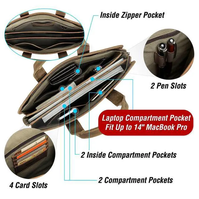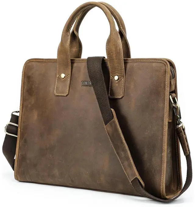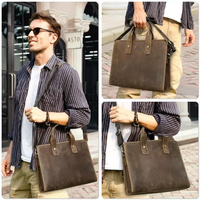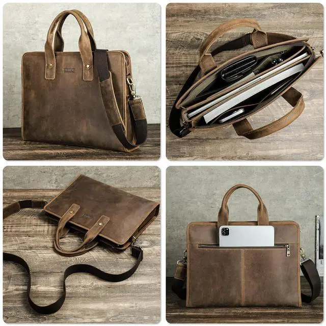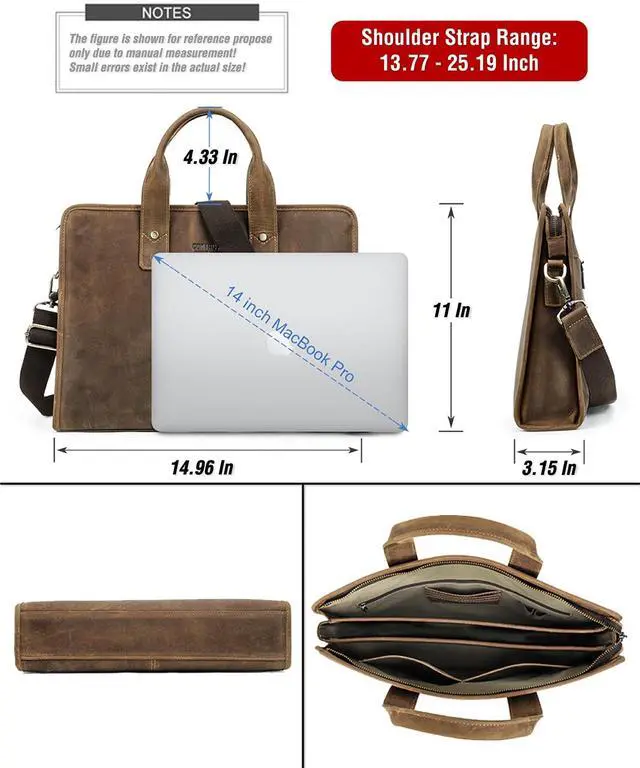 Rugged Top Grain Leather Our Laptop Laptop Crossbody Briefcases are crafted from oil-tanned top grain leather, known as Chamois Leather. Featuring a rough matte texture, this 'Pull Up Leather' naturally develops a rich, unique patina over time, embracing its 'crazy horse' character. ^^ Sleek Vintage Design Handcrafted with a minimalist vintage aesthetic, this product offers a pleasing tactile experience. Measuring 14.96" x 11" x 3.15", it's the perfect slim fit for 14"/ 13.3" MacBook and similar PCs. Combining protection with sleek portability. ^^ Genuine Quality, Lasting Durability Our top grain leather showcases natural characteristics, setting it apart from artificial materials like split grain or PU.
