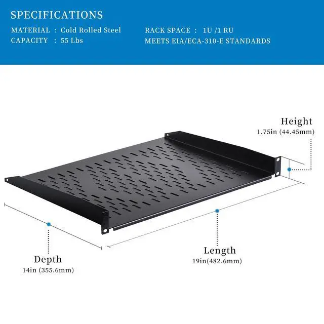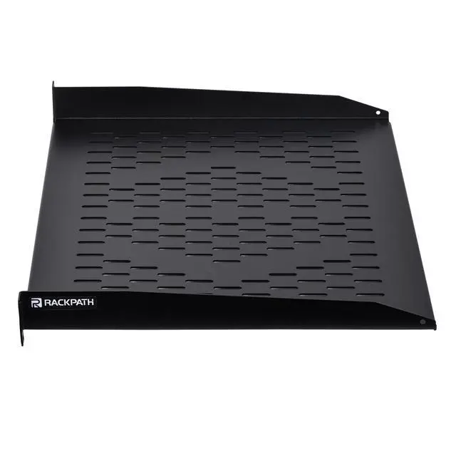 The RackPath cantilever shelf is designed to support your non-rack mountable equipment in your rack such as routers, modems, tower computers, UPS systems and monitors. The vented cantilever tray helps to improve air flow and keeps your equipment from overheating. Constructed from heavy duty cold rolled steel with a durable black electro-static powder coated finish, the shelf has a maximum weight capacity of 55lbs (25kg). All mounting hardware is included.