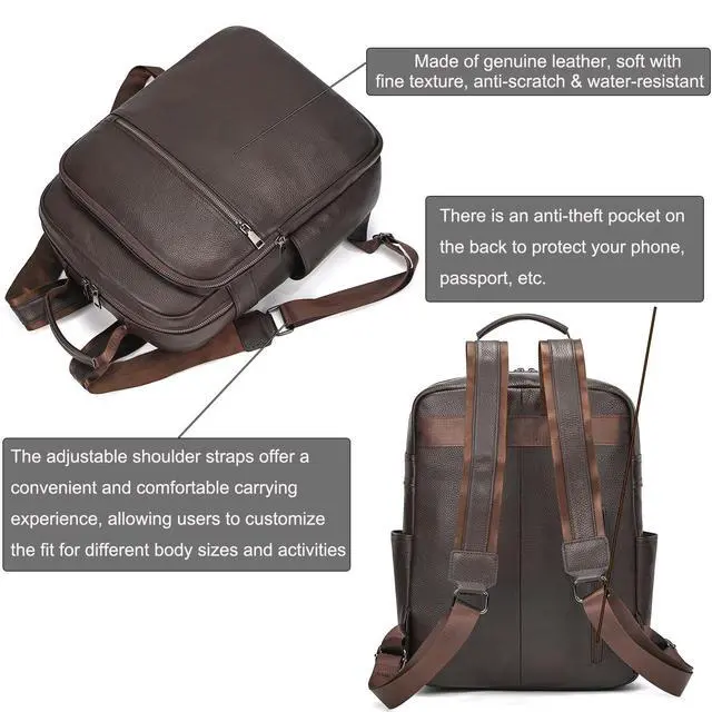 Genuine Leather: The backpack is made of genuine leather and high quality polyester lining. The surface of the leather shoulder backpack is smooth with fine texture, feels good to the touch. It is anti-scratch and durable to use.