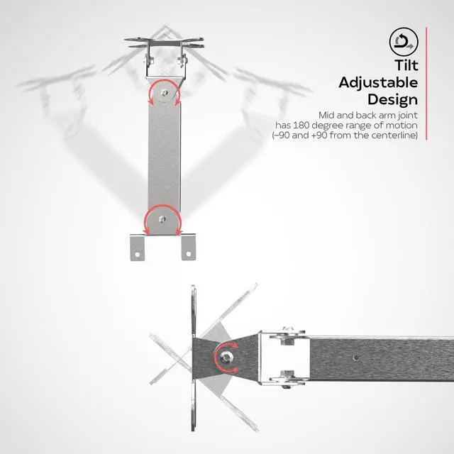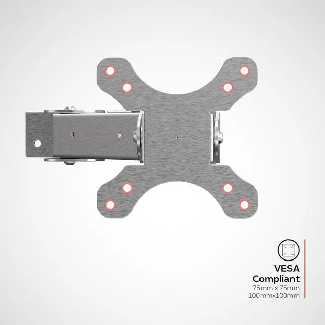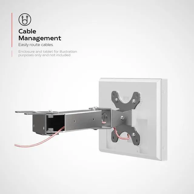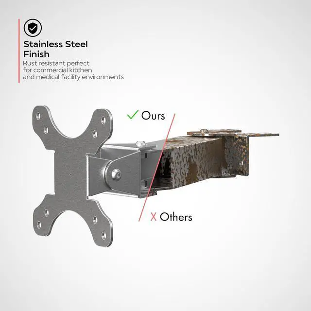 Durable stainless-steel construction and rust resistant - perfect for commercial kitchen environment. ^^ VESA compatible 75mm x 75mm, 100mm x 100mm plate for attaching your tablet enclosure or display monitor up to 13 lbs. ^^ Arm is tilt adjustable in both vertical and horizontal orientation and can be tightened at joints to lock adjustments, so the viewing height is easily adjustable for your preference. ^^ Mid and back arm joints have a tilt adjustability of 180 degrees (-90 and +90 from the centerline). ^^ Cable management is easily maintained by routing cables internally through arm.