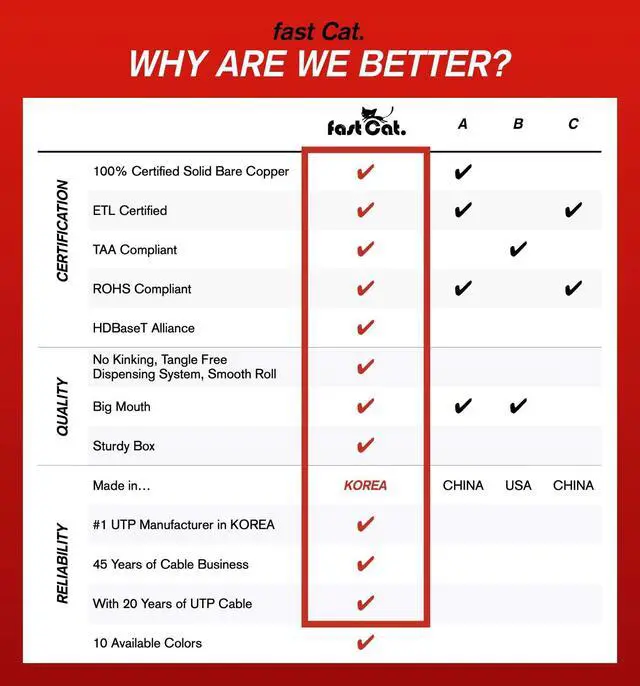 CERTIFIED AND TRACEABLE: All fast Cat. Cables are CSA and ETL Certified, TAA and RoHS Compliant, and CMR flame resistant (IEC 60332-3 Cert). Each cable is part of a detailed lot tracking system, barcode traceable and comes with a full guarantee. When you order now, youll be joining thousands of companies around the world who rely on fast Cat.