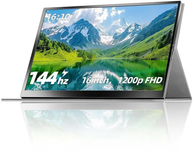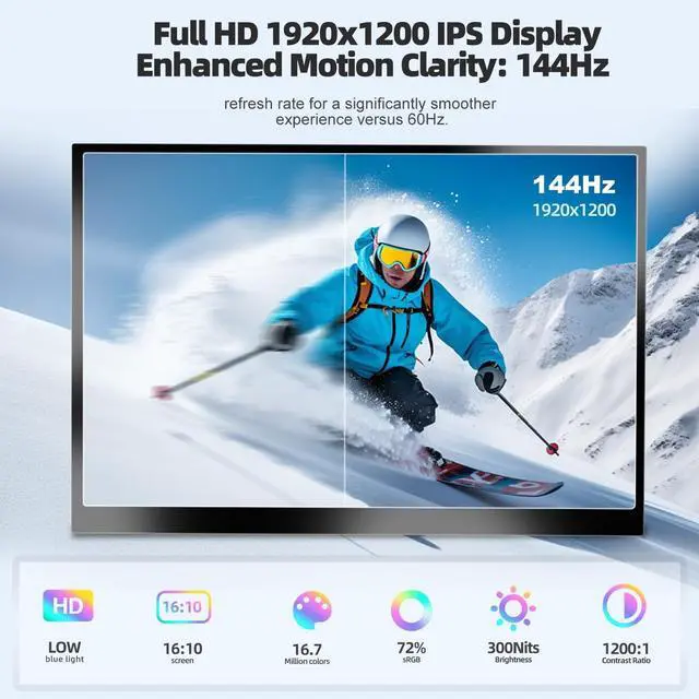 144Hz Smooth Gaming Performance Enjoy ultra-smooth gameplay with a true 144Hz refresh rate and 1920x1200 FHD+ resolution. Ideal portable gaming monitor for PS5, Xbox, PC, and Switch gaming. ^^ IPS Display with HDR & Eye Care This portable monitor features an IPS panel with vivid colors, HDR enhancement, low blue light, and flicker-free technology for long gaming or work sessions. ^^ Ultra-Portable Second Screen for Work Anywhere Only 2.2 lbs and 0.5 inches thin, perfect as a second screen for laptop productivity, remote work, or travel setups.