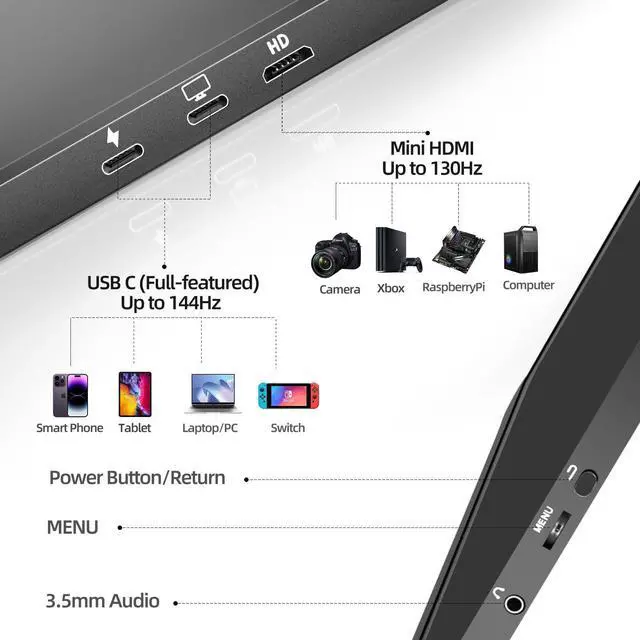 ^^ USB-C & HDMI Plug and Play Works with MacBook Pro, Windows laptops, PS5, Xbox, Nintendo Switch, iPad, and USB-C smartphones supporting DisplayPort Alt Mode. ^^ Boost Productivity & Gaming Immersion Extend your laptop display for multitasking or enjoy immersive gaming anywhere with this versatile portable monitor.