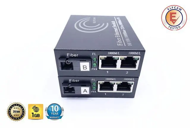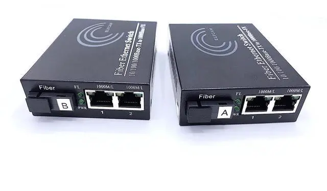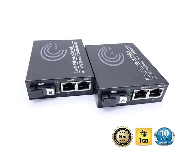 1 Pair Fiber Ethernet Converters, Including Media Converter Mini-GBIC (SFP), With Adaptive Mode 10/100/1000Mbps. Up to 20KM distance over single-mode SC fiber optics. Media Converter B has 4 RJ45 ports. ^^ Featuring both RJ45 Ethernet and SC fiber ports, it integrates easily into a wide range of Gigabit Ethernet network infrastructures. The RJ45 port supports automatic triple speed negotiation (10/100/1000 BASE-T). ^^ Supporting distances of up to 20 km over single-mode fiber optic cable, the media converter offers a simple, reliable solution for connecting Gigabit Ethernet networks to remote locations, while guaranteeing solid network performance.