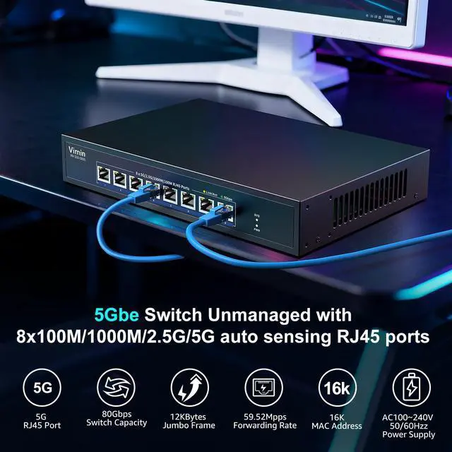 ^^ Self-Negotiation Function: Seamlessly supports multiple speeds (100M/1G/ 2.5G /5G) with intelligent auto-negotiation, the multi-gigabit 5Gbps switch simplifies operational management for diverse networking environments. All ports support wire-speed forwarding. Primarily utilized for 5G NAS, 5G computers, 5G NICs, WiFi 6 routers, 8K video streaming, and more. ^^ 5G Switch Plug and