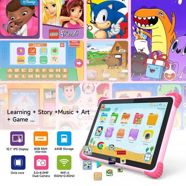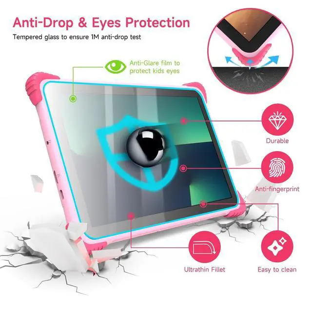 Screen: Our Android 13 kids tablet has a 10.1 -inch touch screen. It's packed with anti-blue light tech and an eye-protection mode to relieve eye fatigue and safeguard kids' eyes. It has 7H hardness glass, making it resistant to scratches and drops. The 1280x800 IPS resolution presents crystal-clear visuals and strikingly vivid colors, whether it's a charming cartoon or an electrifying game. It's made especially for kids 3-12 ^^ 6000mAh Battery+WiFi 6Our Android 13 kids tablet is equipped with a powerful 6000mAh battery that can last 6-8 hours on standby. Say goodbye to frequent charging! It's perfect for short trips. And it offers Wi-Fi 6 2.4G +5G)technology, enabling faster data transmission and ensuring better data privacy protection. ^^