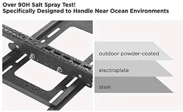 OUTDOOR USE: high quality powder-coated finish to prevents scratches and rust. TV mount pass The 90 Hours salt spray test ^^