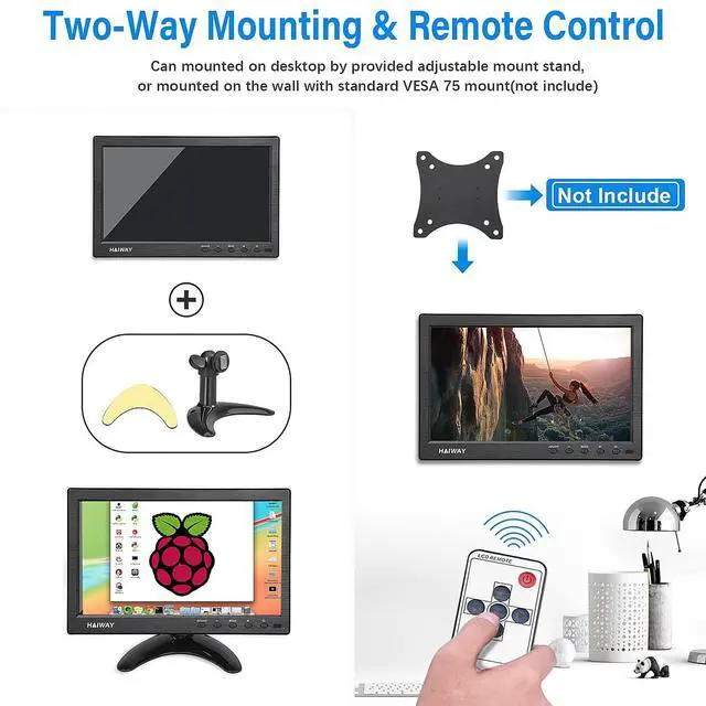 Your Mini Monitor Solution Haiway compact and energy-efficient 10.1 inch HD small monitor features dual built-in speakers for a self-sufficient setup, along with dual power optionsincluding an AC/DC adapter and a vehicle coiled spring cable for indoor or car use. Factory-direct quality ensures rigorous testing and lower failure rates than competitors. ^^ Plug-and-Play Security & Stability This multi-input cctv monitor features dedicated BNC/AV ports for instant security camera connectivity, along with a bright 400cd/m display and a wide 178 viewing angle for clear monitoring day or night. Its VESA 75 mount (not include) compatibility allows for secure wall or desk installation, keeping your setup organized and hazard-free.