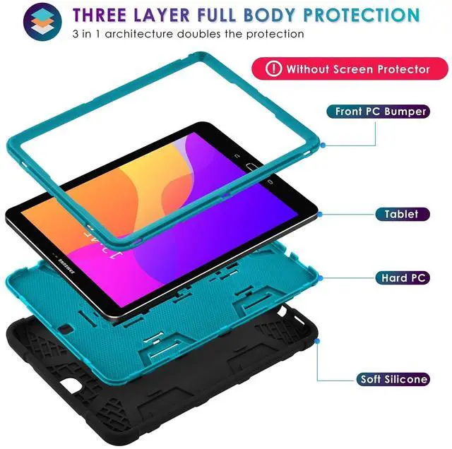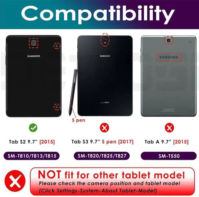 [Warm Tips]: Please check the tablet model and camera position refer to the model compatibility image [2] before purchase (Click "Settings-System-About Tablet-Model"). ^^ 3-Layers Full Body Protection-for Samsung Galaxy Tab S2 9.7" hard case for combined of polycarbonate hard inner shell + flexible TPU outer cover with corner protection design.