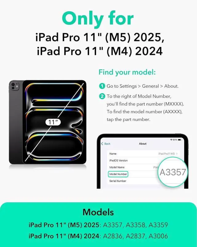 Compatibility: for iPad Pro 11 inch (M5) 2025Model number: A3357, A3358, A3359; for iPad Pro 11 inch (M4) 2024Model number: A2836, A2837, A3006; Not compatible with any other iPad models ^^