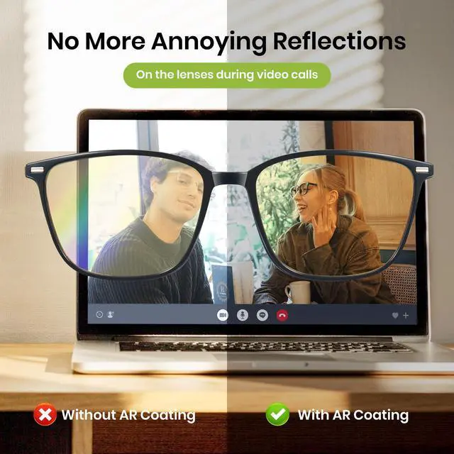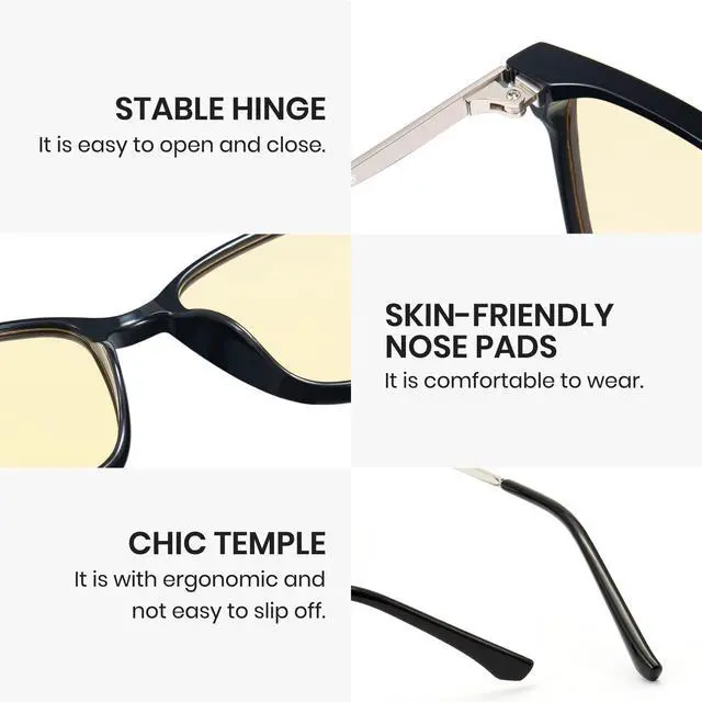 Reduces eye fatigue so you stay productive and less tired at the end of the day. ^^ Ultra-Lightweight TR90 Frame with Soft Nose Pads Only minimal pressure on nose and ears, perfect for all-day wear. Unisex minimalist square design fits most face shapes and styles from professional office looks to casual home use. ^^ Day & Night Versatile Protection Balanced 65% block rate allows comfortable daytime use (work/study) and evening wear (gaming/entertainment) to support better sleep by reducing melatonin-disrupting blue light before bed.
