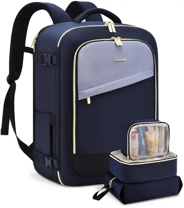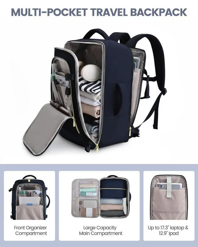 LOVEVOOK Travel Backpack for Today's Woman Elevate your travel style with a backpack that marries fashion with function. Crafted from durable, scratch-resistant materials, this pack stands out in the crowd. ^^ Space Like No Other - A Whopping 40LWhether you're jet-setting for a weekend or heading out for longer, we're talking 40L of spaciousness. Plus, special compartments designed just for your 17.3 inch laptop and 12.9 -inch iPad! Think a weekend's worth of outfits, your tech gear, and then some. ^^ Keep It Clean and Dry Along with 2 packing cubes and an isolated shoe pouch, our backpack features a built-in wet bag.