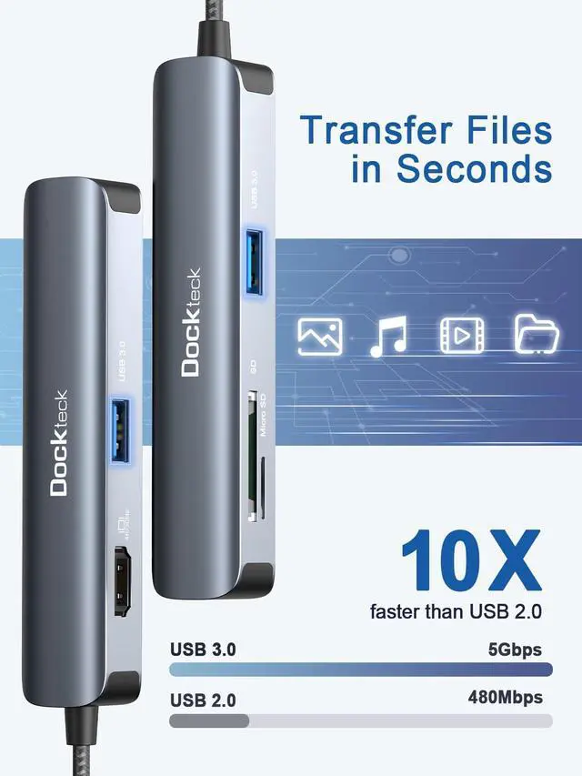 5 IN 1 USB C HUB - Dockteck type c hub can expand single usb c port to 5 multiple ports, equipped with 4K HDMI, 2 USB 3.0 data ports. SD TF card slots. All ports of Dockteck usb c adapter can work simultaneously, small yet mighty ^^ 4K 30HZ UHD VISUAL FEAST - The usbc to HDMI adapter directly extends your screen to stream 4K UHD HDMI to HDTV, monitor or projector via usb c and thunderbolt 3/4 port perfect for home office. Plug and play, no other drivers required ^^ Fast TransmissionTransfer large files up to 5Gbps with 2 USB 3.0 data ports.