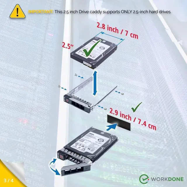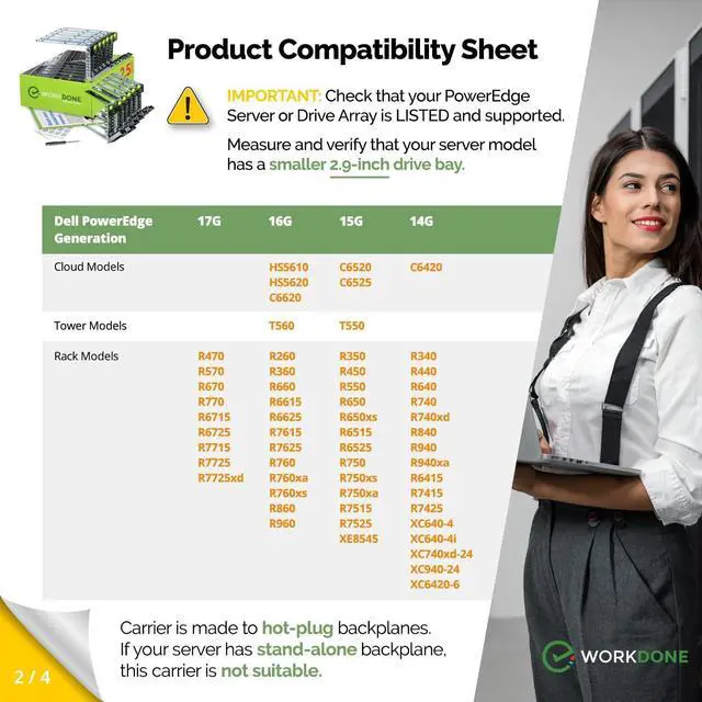 READY TO INSTALL: WORKDONE hard drive trays include all the screws and hardware you need to install. We make our 14th-16th Generation server trays with sturdy material, inspect each one individually, and carefully pack them for safe shipping. NON-OEM/NON-ORIGINAL ACCESSORY PART; Compatibility with part numbers DXD9H and 0DXD9H. Supported ONLY Hot-Plug small 2.9 -inch Drive Bay. NOT compatible when your server has a bigger 4.2 -inch drive bay ^^ 4-YEAR
