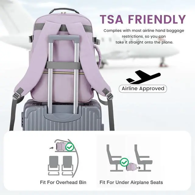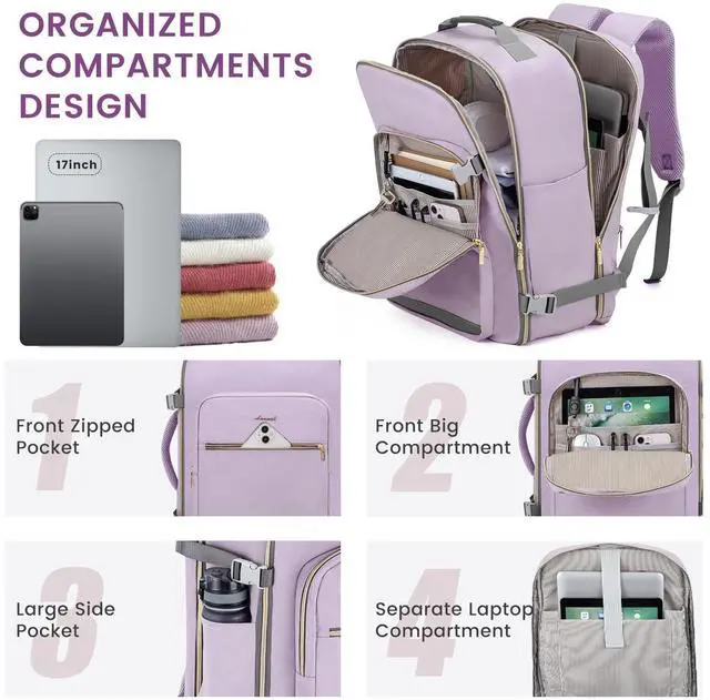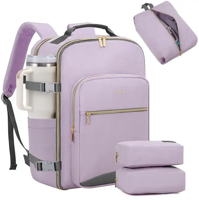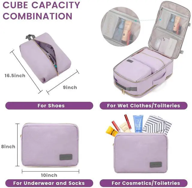 The side straps can also help you compress the pack when it is too full. ^^ BACKPACK FOR TRAVELING ON AIRPLANESWith an 18*14*8 inches size, this travel backpack meets the standard of personal item bags of airlines. It can be put on the luggage set and under the seat easily. The luggage strap on the back of the backpack allows it to be stably attached to a suitcase. ^^ WELL-DESIGNED COMPARTMENTSThis travel backpack has 4 main compartments and 3 packing cubes supplied, which enable you to keep your things in order. Your shoes, toiletries, and underwear can be placed in separate packing cubes.