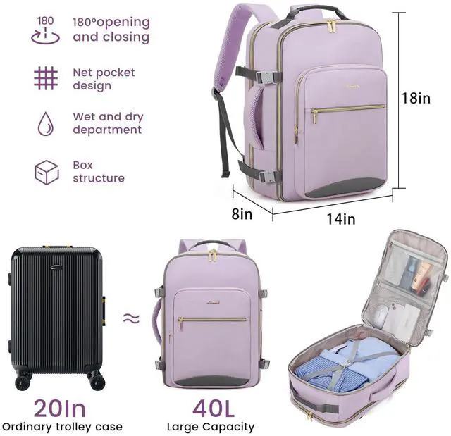 PRACTICAL BOX STRUCTURE DESIGN The carry-on backpack can be expanded 180 with a box structure, more convenient for you to pack things up. The dedicated electronic product compartment on the back can be used to store your electronics, which can be quickly taken out when going through the security check. ^^ 40L LARGE CAPACITYOur travel backpacks enable you to pack all your travel essentials for a 3-5 day travel, which can hold 3-5 days' clothing, a pair of shoes, your wallets, toiletries, a 17.3 '' laptop, a 12.9 '' iPad and so on.