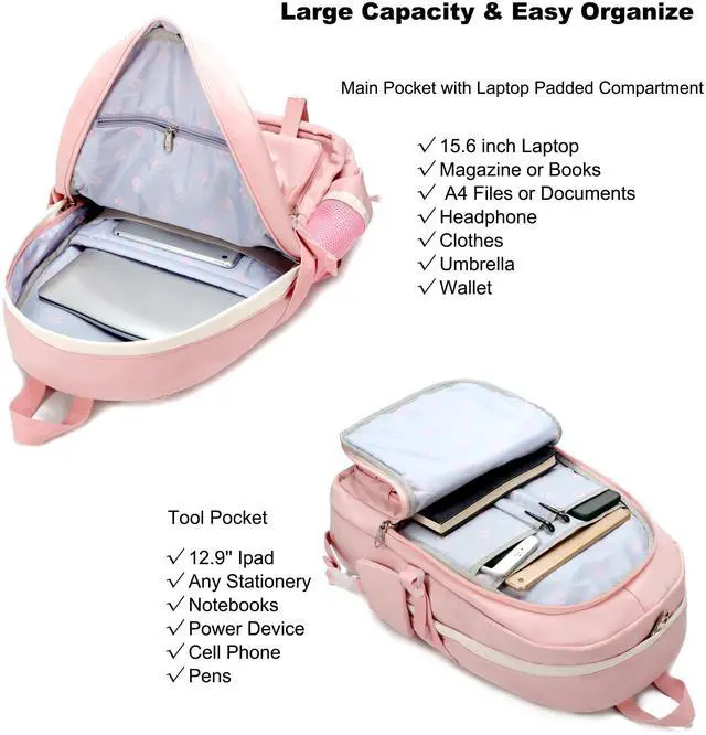 Large Size & Gift: The size of back pack is 13.8" x 7.5" x 17.8" (L*W*H), Weight: 1.65 LB. The laptop bag with padded compartment sleeve fit for 13.3, 15.6, 16.1 inch tablet. This women book bag also along with fluffy ball key pendant and personality badge as gift makes the bags more fashionable and unique ^^ Waterproof