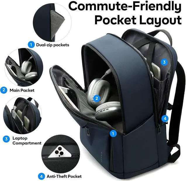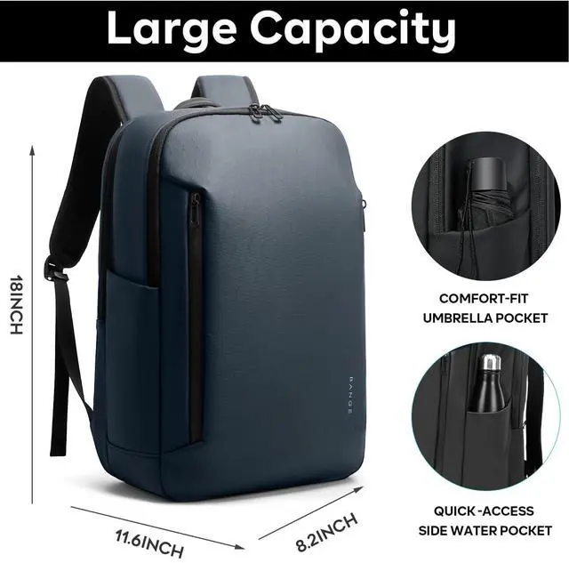 1 anti-theft pocket for storing valuable items. 1 laptop compartment suitable for carrying a 15.6 -inch laptop and a 9.7 -inch iPad, among other electronic devices. ^^ SIZE AND MULTI-SCENARIO APPLICABILITYWith dimensions of 11.6" x 8.2" x 18" (L x W x H) and a capacity of 28L, the moderate size and capacity combination makes the backpack suitable for various scenarios such as college, business, travel, commuting, shopping, camping, hiking, weekend getaways, air travel, and everyday use. ^^ HUMAN DESIGNThe BANGE Business Laptop Backpack features a simple and smooth design.