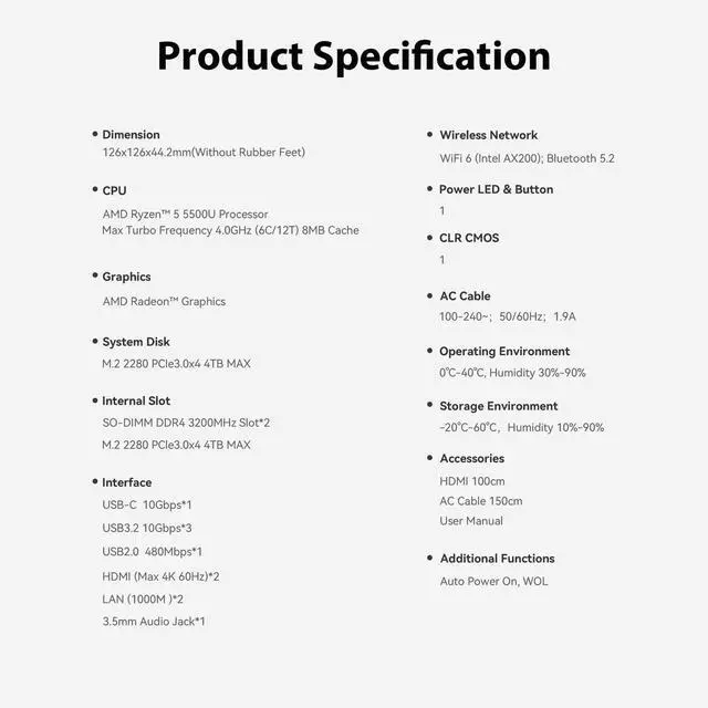 Tower Performance & Powerful Processor Powered with AMD Ryzen 5500U 6C/12T, 2.1GH z by default but can boost up to 4GHz, which can turn your desk into a powerful workstation just by adding a keyboard, mouse. Pre-installed with W- 11 without any bloatware. The Beelink EQR5 mini pc can be used for video and photo editing, office tasks, 4K video playback. ^^ Compact & Rich Interface & Built in Power supply unitEasy to setup and small in size. WiFi 6 ( 802.11 ax), Bluetooth 5.2 is faster and more stable.