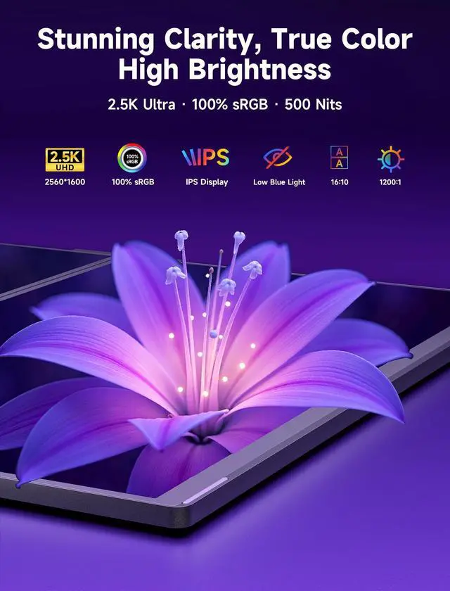 Dual Screen 2.5KT he JSAUX FlipGo Pro 16" IPS monitor supports dual 2.5K high-resolution displays. It features a 100% sRGB color gamut, a 16:10 screen ratio, 500 nits screen brightness, and a 1200:1 contrast ratio. FlipGo aims to establish a new standard in high-quality portable displays, born for users who prioritize excellence[The JSAUX FlipGo Portable Monitor lineup includes five models: PM0201, PM0204, PM0205, PM0207, and PM0209. Each one is designed with unique features to suit different needscheck the detail page for a full comparison] ^^ Unlock Endless PossibilitiesExplore three display modes with the FlipGo Pro 16" dual laptop screen extender: