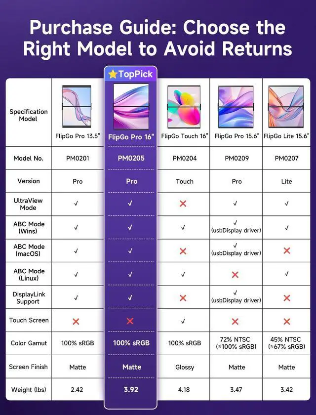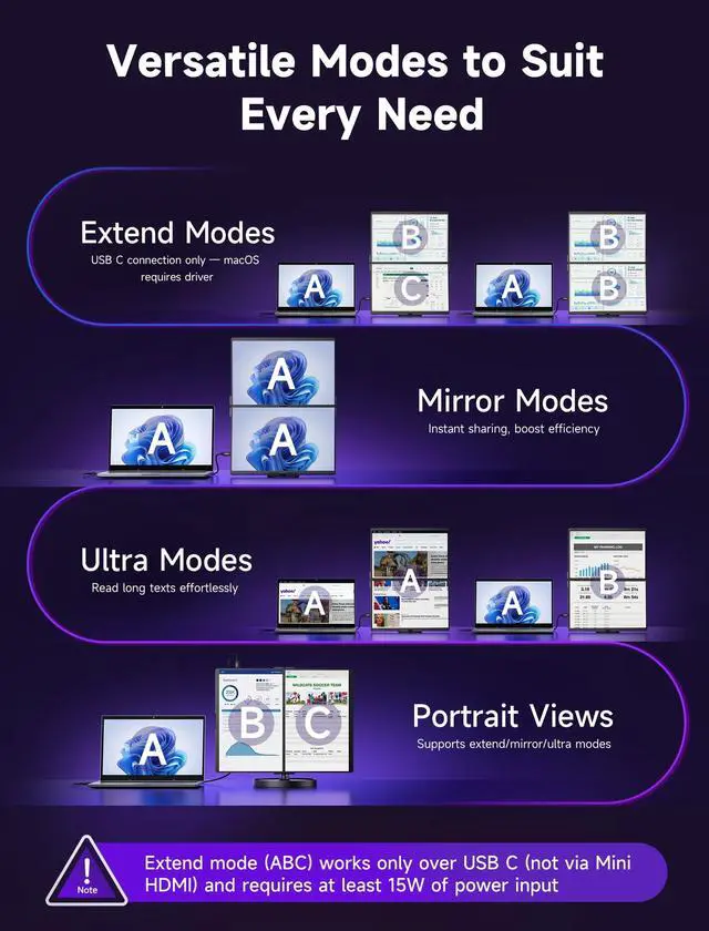 (Note: Mode support varies by system and port. See product images for details or contact our support team. ) ^^ Triple Display ExtendABC ModeUtilize ABC mode with your portable dual monitor to extend your workspace across three screens, offering greater flexibility for multitasking and enhancing productivity. Whether for financial analysis or creative projects, this mode provides expanded screen real estate tailored to diverse needs (macOS requires the DisplayLink driver to enable ABC mode) ^^ Ultra Modes (Ultra View) FlipGo Pro 16" portable monitor features Ultra mode, seamlessly combining both screens into one ultra-wide displayideal for video editing, timeline review, and immersive multitasking. Compatible with Windows, macOS, and Linux for maximum flexibility ^^ One Cable Connects Two ScreensFlipGo Pro 16", a dual portable monitor, draws power directly from your laptops USB C portlighting up two screens with just one cable. When connected to an external power source, it reverse charges your laptop.