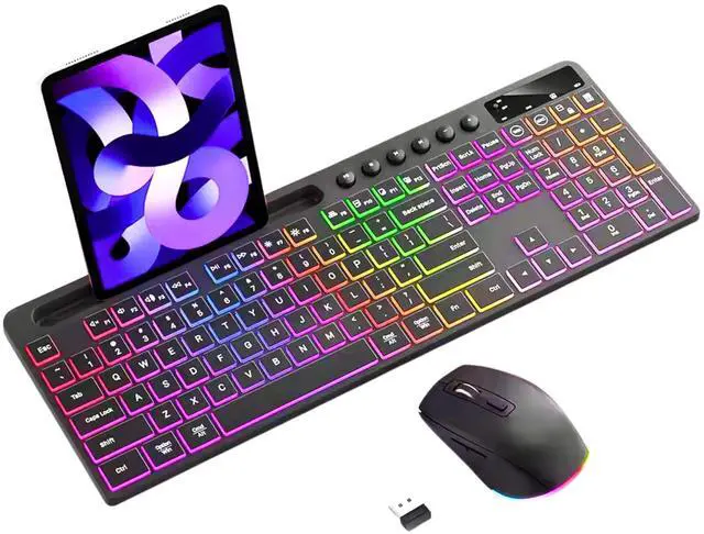^^ Gorgeous Rainbow RGB Backlight3 Levels Adjustable Brightness Wireless keyboard and mouse designed with adjustable rainbow backlight, bright keys for easy typing at night. ^^ Quiet and Comfortable TypingWireless PC, Laptop Keyboard with soft membrane keys for silent and smooth typing. Wireless Chargeable Mouse clicks are almost silent. ^^ Wide CompatibilityThe Wireless Keyboard and Mouse are compatible with MacBook, Windows, PC and laptop.
