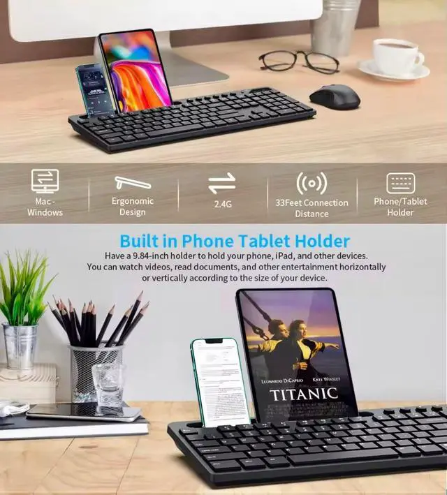 Device Stand 2.4GH z Wireless Keyboard and Mouse with 7.8 inch multi-function phone and tablet stand. ^^ 114 Key Full-Size Keyboard Our Wireless and Rechargeable Keyboard is more Comfortable and Efficient, Get more done in less time with 13 Function Keys and 6 Multimedia Control Keys that let you instantly access to music, media, volume, and your frequently used applications. ^^ Rechargeable Battery Wireless keyboard equipped with a 1000mAh long battery life with 365 Days Standby Time, and Our Silent Wireless Mouse is equipped with 500mAh with 270 Days Standby Time. Both extend the service life by 30%.