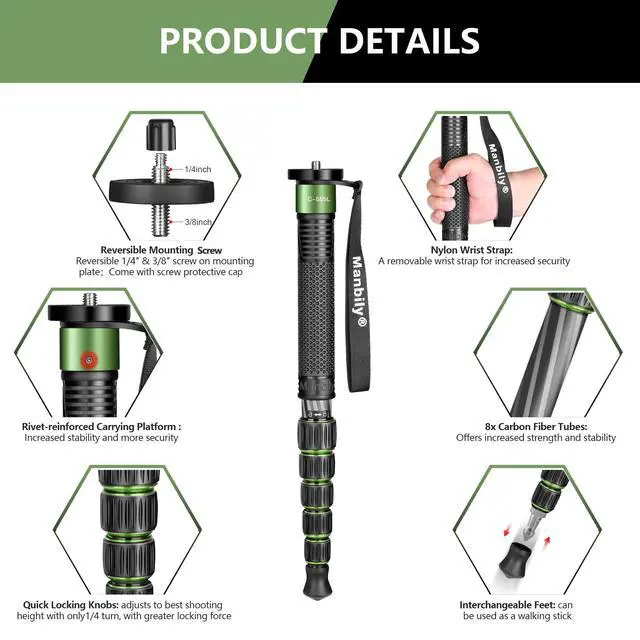 Camera Monopod: The Manbily C-555L travel monopod weighs only 0.93 lbs and folds down to 15.7", making it an ideal travel, sports, and wildlife photography companion - compact and lightweight ^^