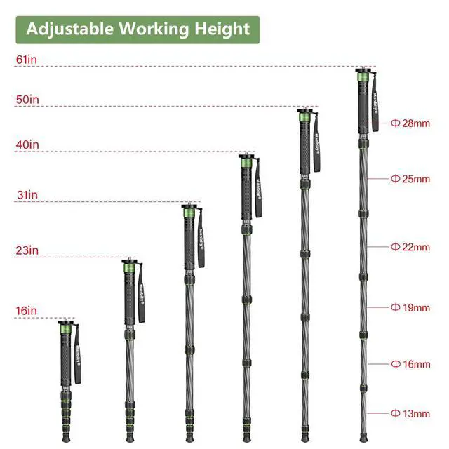 Carbon Fiber Monopod: 28 mm thick leg with 8-layer carbon fiber construction for greater strength (up to 15.4 lbs load) and stability. Carbon fiber materials are lighter and stiffer than aluminum and can withstand heavy loads ^^ Reinforced