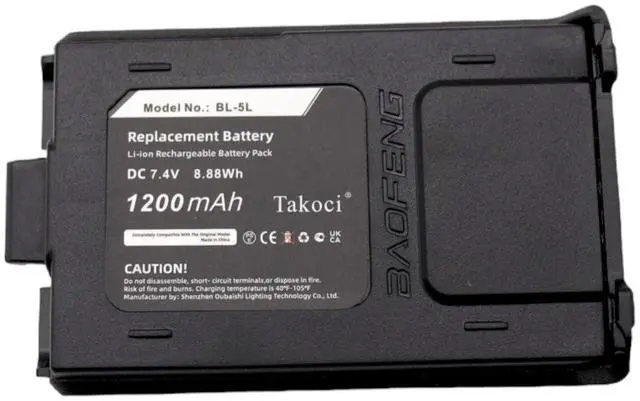 CompatibleModel: BF-F8PLUS, BF-F8+, BF-F8HP, BF-F9, BF-F9V2+HP, TYTF8, TYTF9, UV-5A, UV-5B, UV-5C, UV-5E, UV-5R, UV-5RPlus, UV-5R+, UV-5RA, UV-5RAX+, UV-5RE, UV-5RHP, UV-5RLCompatibleBatteryPartNumber: BL-5, BL-5LSpecifications:
