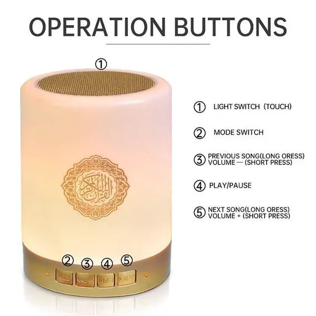Experience the serenity of the Quran with this remarkable Quran Speaker Quran Cube. This innovative device combines the power of a Quran player, night light, and Bluetooth speaker into one sleek and portable unit. Immerse yourself in the divine words as you listen to high-quality audio recitations, or connect your smartphone via Bluetooth to enjoy your favorite playlists. The soothing night light feature creates a tranquil ambiance, perfect for evening prayers or relaxation. Crafted with precision, this Quran Cube is an ideal Eid Mubarak or Hajj gift, allowing you to carry the teachings of the Quran wherever you go.