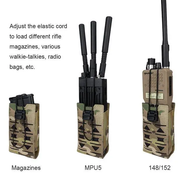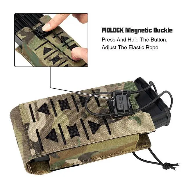 ^^ ADJUSTABLE DESIGN: The bungee cord on the top and a flex-dura UTX buckle can be adjusted according to the size of the loaded walkie-talkie or other equipment such as 5.56 / 7.62 magazines, small water bottles, etc. The FIDLOCK magnetic buckle is very convenient to open and close quickly with one hand. Of course, it can also be used to adjust the tightness of the fixed.