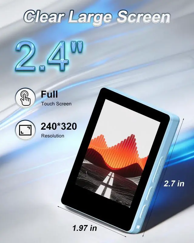 Bluetooth combines five core functions: Music, Recorder, Ebook, FM Radio, and Picture Viewing. No account registration requiredpower on and use immediately. Intuitive operation with enhanced privacy. ^^ 2.4 '' Full Touch Screen 2.4 -inch full touch screen offers responsive sliding control and smooth navigation. 240*320 HD resolution ensures sharp text and detailed graphics for comfortable viewing. ^^ Smart Index SelectionAlphabetical index allows instant song search by title for precise selection.