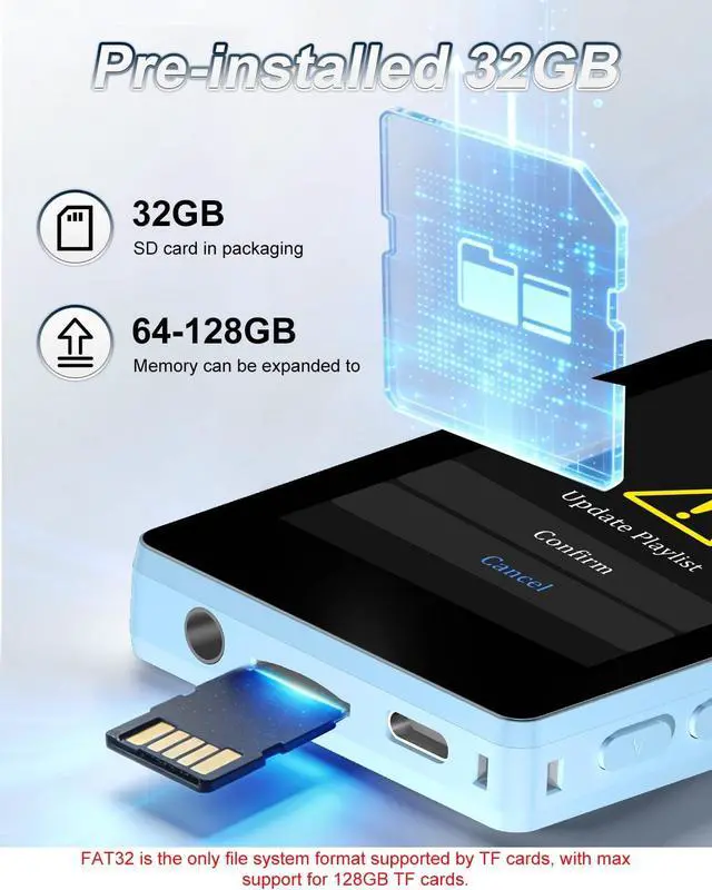 Bluetooth 5.2 Wireless ConnectionPortable MP3 Player Advanced Bluetooth 5.2 technology ensures stable connectivity, efficient data transfer, and extended battery life. Easily pair with wireless earbuds or speakers for instant setup. Enjoy a seamless wireless music experience anytime, anywhere without cables. ^^ Ample Expandable StorageMini Music Player Pre-installed with a 32GB memory card, store and play a huge amount of music instantly. Supports TF card expansion up to 512GB (sold separately), offering flexible storage management for both local and expanded content. (Memory cards only support FAT32 format. ) ^^ Hi-Fi Immersive Sound Portable Kids Bluetooth MP3 Player built-in Hi-Fi speaker delivers clear vocals, powerful bass, and an immersive listening experience.