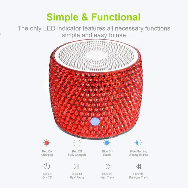 Unique Stunning Design - Hand laid LUXURY AUSTRIAN rhinestone crystals adds sparkle and bling to your space, a bedazzled unique gift. It is not only a high-quality mini wireless speaker, but also a desktop artwork. Also, the various color option and the compact size make it the best choice for home, office or travelling use. ^^ Amazing Bass Loud Sound - The wireless speaker delivers 3W stereo sound, releasing crystal clear sound with bass and room-filling loudness through a high-performance driver and a passive subwoofer. Small, but such powerful Bluetooth speakers.