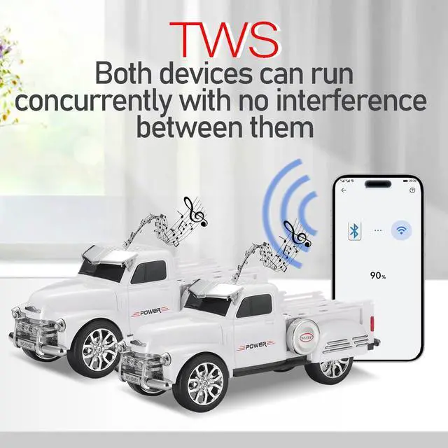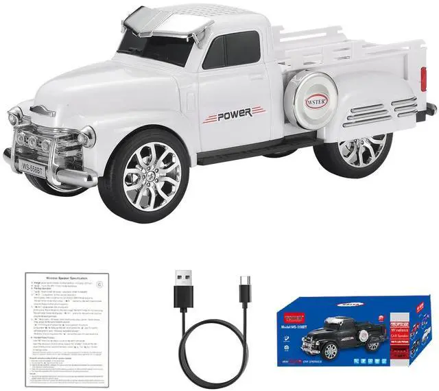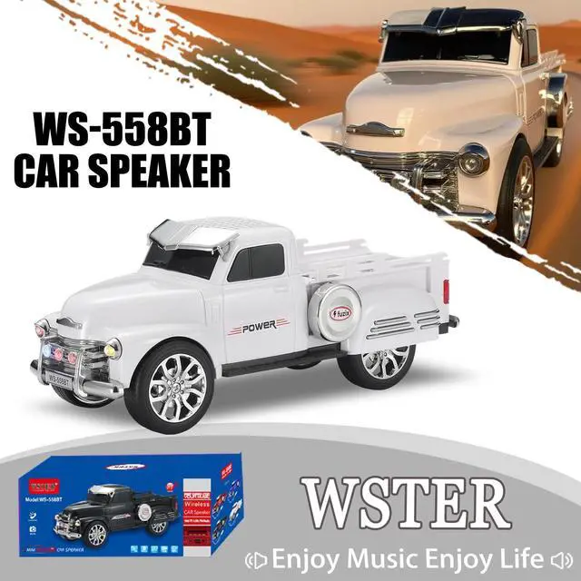Unique Pickup Truck Design A cool and stylish replica speaker with movable wheels, perfect for car enthusiasts, desktop decorations, or as a fun surprise gift ^^ HD Sound with TWS Pairing Dual drivers deliver powerful HD sound. Use TWS pairing to connect two speakers for true stereo surround audio ^^ Multiple Playback Options Supports Bluetooth 5.4, USB playback, TF card input, and FM radio, giving you flexible ways to enjoy music anywhere ^^ Hands-Free Calls with Built-in Mic Answer calls directly through the speaker with Hands Free Link and the built-in microphone for clear communication ^^ Portable & Party-Ready With LED party lights, Type-C charging, and a compact pickup truck design, the WS-558 is perfect for home, parties, camping, or outdoor fun