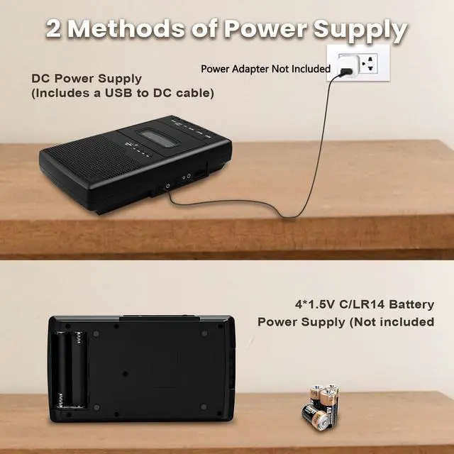 No software required - just connect to your computer via USB, press transfer, and save your music/podcasts forever. No computer and software required. ^^ Dual Power Options for PortabilityPowered by AC adapter (not included) or 4*C batteries (not included), use this cassette player at home, in your car, or outdoors. The retractable handle makes it easy to carry. ^^ Crisp Audio with Enhanced PlaybackEnjoy high-fidelity sound quality with reduced noise and adjustable speed control. The built-in 3.5MM earphone jack and 3W stereo speakers deliver clear audio whether you're revisiting old albums or digitizing rare recordings.