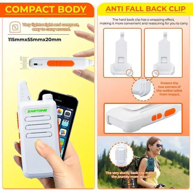 Small and lightweight; 9.6*5.5*2.2cm/3.7*2.1*0.8inches; compared with most large and heavy walkie-talkies; adopts a lighter and thinner compact design; allowing you to carry it easily and enjoy more comfortable communication