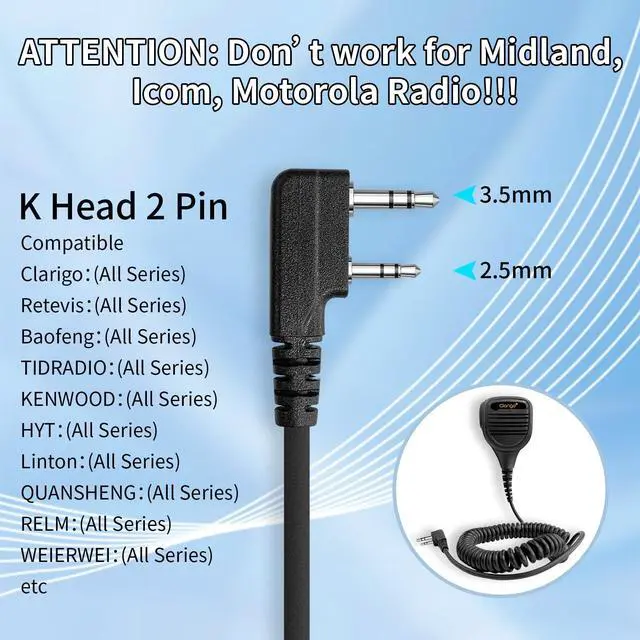 Pin Plug: Clarigo C walkie talkies earpiece use K Head 2 Pin Plug that is compatible with Baofeng UV-5R/888S, Retevis H-777/R21/RT22, Kenwood TH-F6/F6A/D7 and so on. To see more compatible information, please seach in the description page.