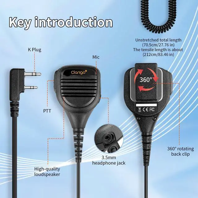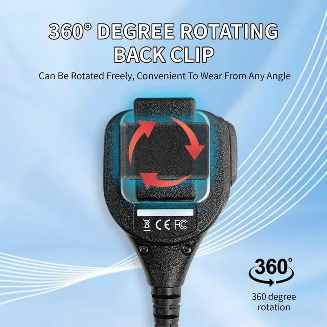 ^^ Rugged Construction: Walkie Talkie Microphone with high impact-resistant engineering Polycarbonate plastic housing, SMT electronic board, internal vibration absorption system, stainless steel detachable 360-degree rotatable heavy duty clip, combined with precise molding technology, this speaker microphone is built for tough mission critical use and is built to withstand knocks and bumps. ^^ Super