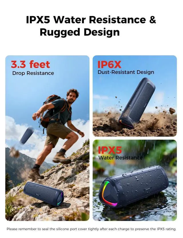 • [Tough & Weather-Resistant] Engineered to handle rough use and adverse weather conditions, this speaker features a durable design and an IPX5 rating for protection against water splashes and spills. It's an ideal choice for outdoor events, and is perfect for use at parties, at the pool, on the beach, while camping or hiking, and more